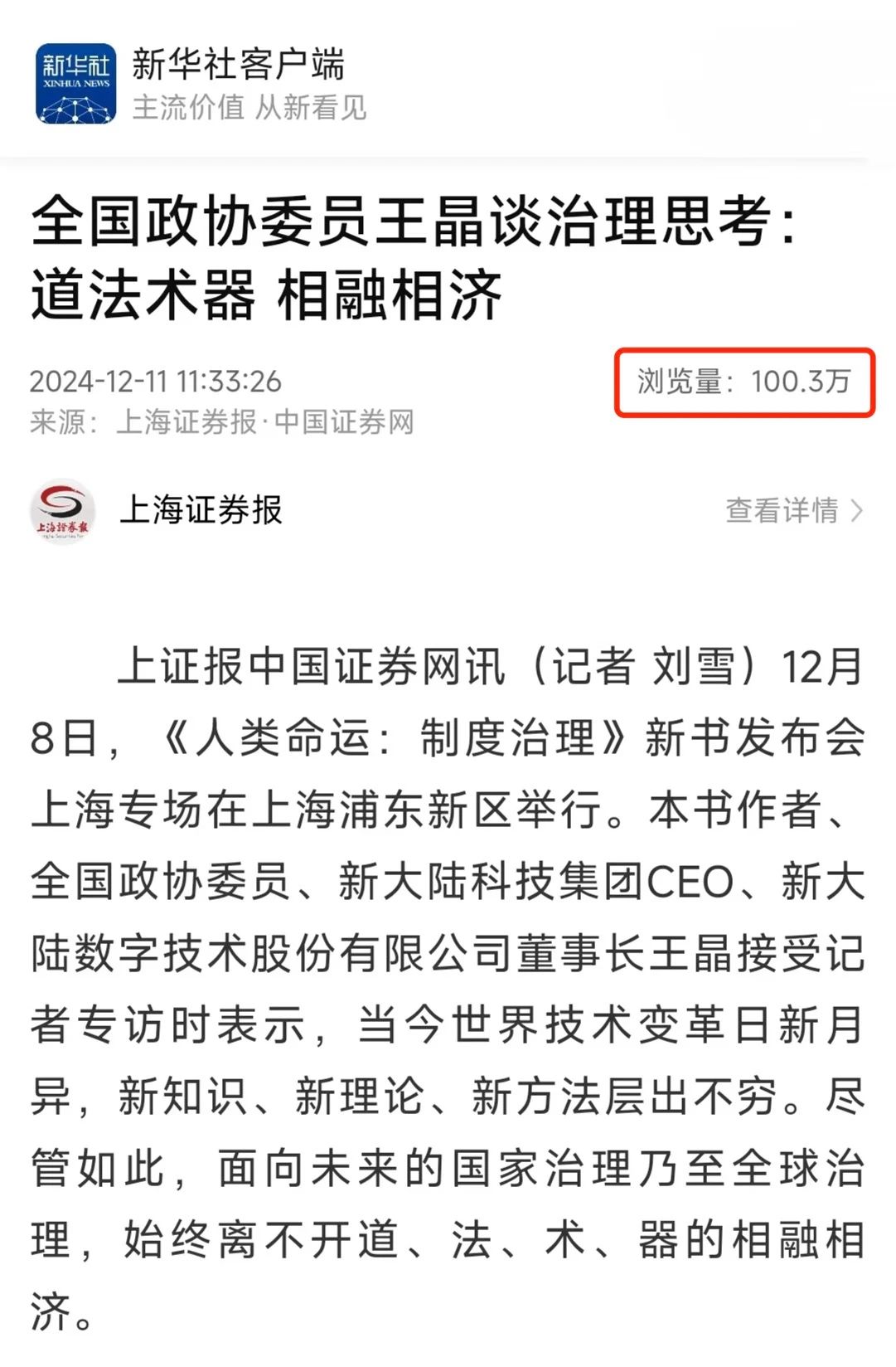 12月8日,《人类命运:制度治理》新书发布会上海专场在上海浦东新区举行。本书作者、全国政协委员、z6com尊龙科技集团CEO、z6com尊龙数字技术股份有限公司董事长王晶接受记者专访时表示,当今世界技术变革日新月异,新知识、新理论、新方法层出不穷。尽管如此,面向未来的国家治理乃至全球治理,始终离不开道、法、术、器的相融相济。