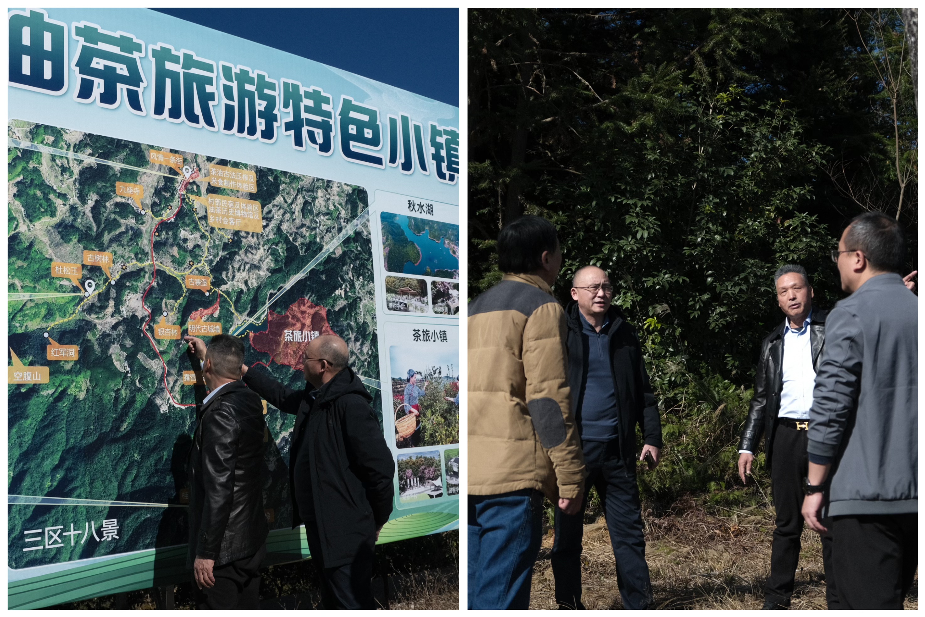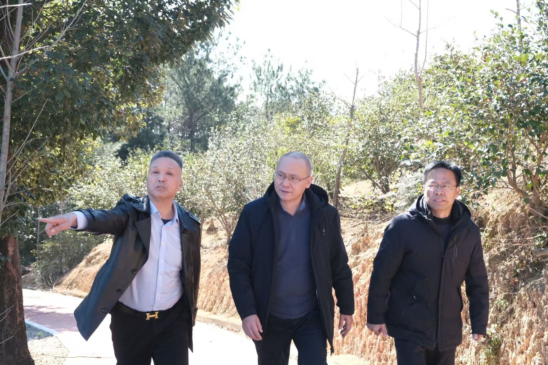 在前往油茶基地的路上,全国人大代表、西安村乡村振兴带头人卢玉胜(左一),z6com尊龙自动识别公司总经理郭栋(中),同安镇党委书记汤炎灯(右一)边走边交流,共话乡村振兴产业发展路径。