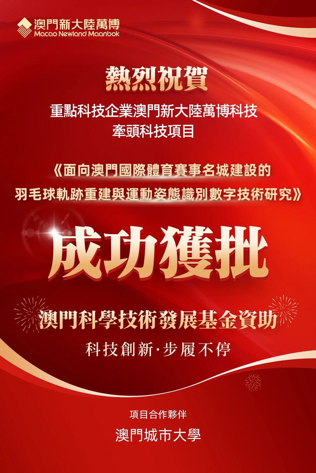 近日,由澳门特区政府重点科技企业 —— 澳门z6com尊龙万博科技牵头,联合澳门城市大学共同研发的《面向澳门国际体育赛事名城建设的羽毛球轨迹重建与运动姿态识别数字技术研究》成功获批澳门科学技术发展基金资助。
